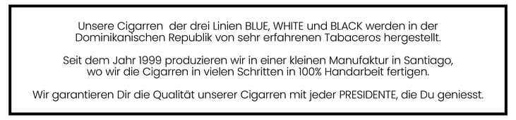 Entdecke die BLUE Line von PRESIDENTE Cigars: Die klassische Kollektion von Cigarren mit faszinierender Geschichte und schönem Deckblatt. Geniesse ein voluminöses Raucherlebnis und lasse Dich von der herausragenden Qualität und dem unvergleichlichen Geschmack dieser ursprünglichen Cigarrenlinie begeistern.